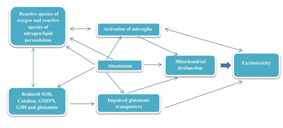 Mitochondrial injury caused by the aluminium leads to triggering of overpriced highly reactive oxygen free radicals and hydroxyl free radicals and eventually cause hydrogen peroxide amass and gathering. Further the raise in amass of hydrogen peroxide intensify the influence of redox active iron further from relatively bound iron or by modulating the electron transport chain (Bondy et al., 1996). In addition, aluminium gives raise to oxidative damage through triggered Fenton reactions which is iron arbitrated, by enhancing the concentration of redox active iron. Also research manifests by aluminium superoxide dismutase is activated and further catalase is inhibited by aluminium (Bondy et al., 1996; yousef et al., 2004). Moreover, aluminium may enhance the excitotoxicity, which is glutamate induced and ultimately suggested and theorize that the outcome of neurotoxic of aluminium be arbitrated through an excitatory amino acid and glutamate (Nayak et al., 2001). neurodegenerative sequel of Aluminium and the probable mechanisms as related to excitotoxicity is outlined in Fig. 2.