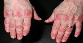 Papules with a violaceous tint that are located over the dorsal-lateral aspect of interphalangeal and/or metacarpophalangeal joints are referred to as A. Gattron's papules. When they are fully developed, these papules develop a little depression in the centre, which might give them a white and atrophic appearance. There is a possibility of association with telangiectasia. Poikilodermatomyositis, also known as circumscribed violaceous erythema [20].