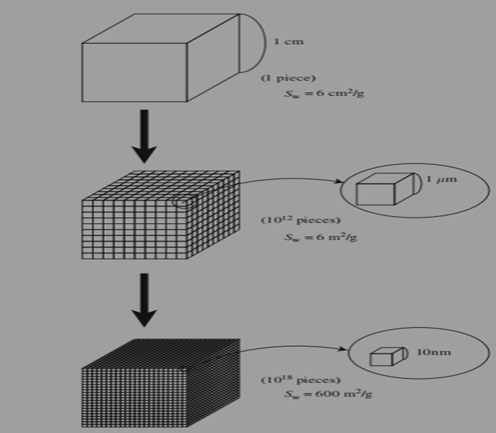 On the other hand, as the micritization of solid particles, the specific surface area increases generally in reversal proportion to the particle size. In the abovementioned case, when the particle of 1 cm is micronized to 1 mm and 10 nm, the specific surface area becomes ten thousand times and million times, respectively. As the increase in the specific surface area directly influences such properties such as the solution and reaction rate of the particles, it is one of major reasons for the unique.