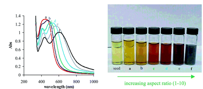 Fig. Aqueous solutions of silver nanoparticles show wide variations in visible colour depending on the aspect ratio of the suspended nanoparticles. The far left of the photograph shows silver nanospheres (4 nm in diameter) that are used as seeds for subsequent reactions, while (a–f) show silver nanorods with increasing aspect ratios from 1–10. The corresponding visit absorption spectra for (a)–(f) are also shown in the left panel. Reprinted with permission from Copyright: ©2002, WILEY-VCH Verlag GmbH, Weinheim, Fed. Rep. of Germany.