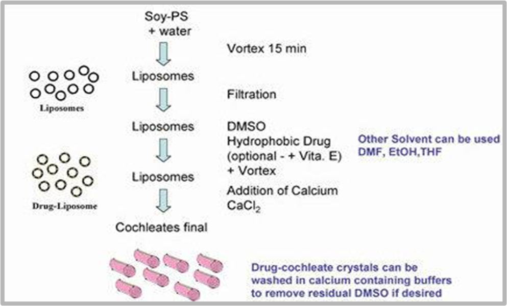 In trapping method , phosphatidylserine liposome was formed by vortexing , and adding solution of calcium chloride (Cacl²) drop by drop and then by addition of water to phospholipid powder or by adding water to phospholipid film and The resulting cochleates were washed with calcium buffer to remove residual solutes.