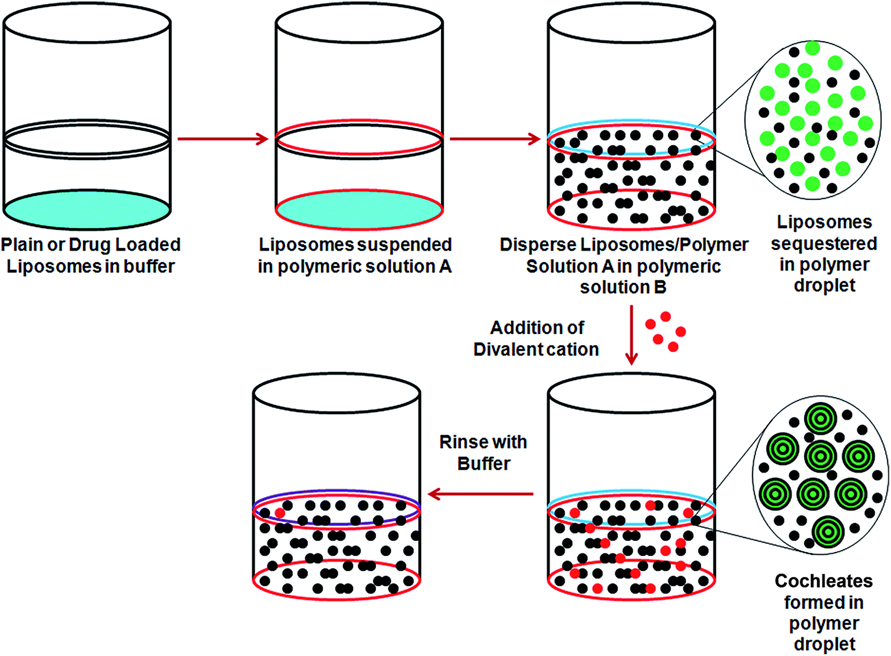In this method initially the small unilamellar drug loaded liposomes were prepared, which were added to polymer A (phosphatidylserine, dextran/ polyethylene glycol, etc.). This dispersion phase was then added to another polymer B (polyvinylpyrrolidone/ Polyvinyl alcohol/ Ficoll/ polyvinyl methyl ether, etc.) There is formation of aqueous two phase system ,due to the immiscibility of polymer A and polymer B There after, an cation salt solution was added to the polymer two-phase system and lead to formation of cross linking of polymer, such that the cation diffuses into the second polymer ,and then particles composed of liposome /polymer.