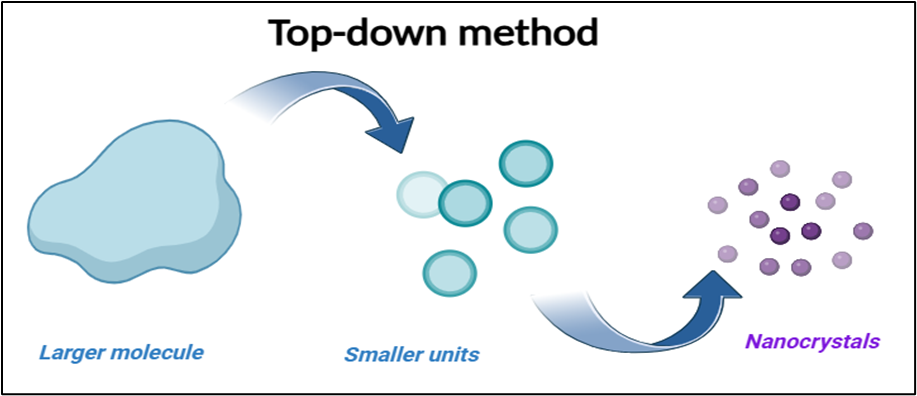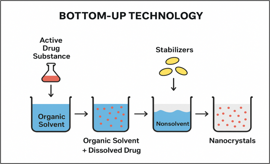 Bottom-up procedures aggregation of the molecules in solution lead to the formation of particles that can have either crystalline or amorphous structures. bottom-up methods make it easier to change the surface functioning of nanoparticles and combine several active substances into a single nanocarrier. However, the requirement to exclude organic solvents raises production costs and is a basic drawback of many precipitation techniques. Especially for drugs that are poorly soluble in water and organic solvents, substantial quantities of solvent are required if. As a result, the pharmaceutical industry has not produced marketed medications using bottom-up methods4.