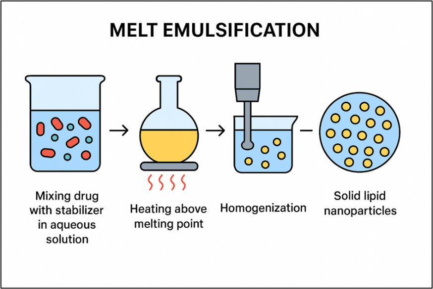 First, the drug is mixed with a stabilizer in an aqueous solution. then this mixture is heated to a temperature above the drug’s melting point, which causes the drug to melt. After the drug melts, the hot mixture is rapidly mixed using a homogenizer, which forms an emulsion. When this emulsion is cooled, solid lipid nanoparticles are formed6.