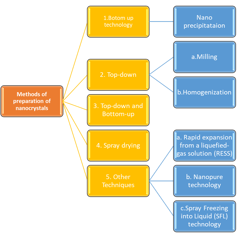 Several grinding and homogenization procedures are used as dispersion methods when "top-down" technology is applied. The breaking up of larger crystal particles into smaller pieces is caused by this process. The methods of high-pressure homogenization (Nanopure, IDD-P, Disso Cubes) or media milling (NanoCrystals) can be used to accomplish this technique5.(5)