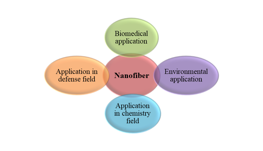 Nanofiber is a branch of nanotechnology; it has unique properties such as a high surface area to volume ratio, high aspect ratio, and high porosity these properties enable nanofibers to serve a wide range of functions and applications in different areas, such as biomedical applications, applications in the environmental field, applications in the defense field, and applications in the chemistry field. Fig. 5 shows the application of nanofiber in different areas.