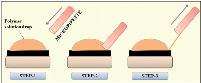 Drawing is a method similar to dry spinning used to produce single nanofibers of longer length(11).In the drawing process, contact is made with the sharp tio of a micropipette or a glass rod with a previously deposited polymer solution droplet. After that the micropipette or a glass rod is then withdrawn slowly, thus producing nanofibers. While drawing the micropipette or glass rod, the solvent evaporate from the liquid fibers and ultimately solid nanofibers are formed. The rate of withdrawal is based upon polymer nature. solution of polymer used for drawing is selected based on its viscoelastic properties, i.e. it should overcome the stresses developed during pulling and undergo a higher range of deformations. the solvent used to prepare the polymer solution is evaporated during the drawing process, resulting in the formation of dry, solid nanofibers.