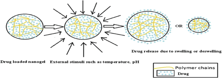 Both type of drugs (hydrophilic and hydrophobic drugs and charged solutes) can be given through nanogel. Such properties of nanogel are significantly influenced by temperature, presence of hydrophilic/hydrophobic groups in the polymeric networks, the cross-linking density of the gels, surfactant concentration, and type of cross-links present in the polymer networks.