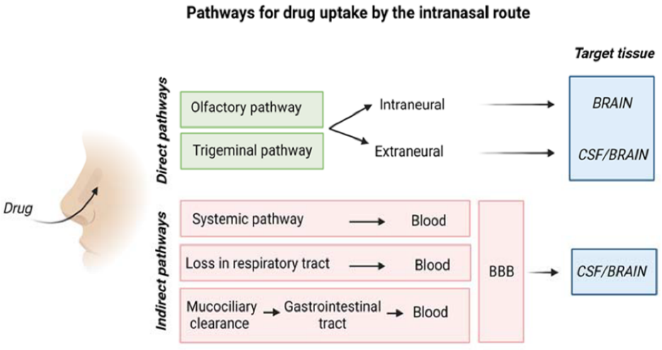 Numerous researches have examined and documented nose-to-brain delivery routes. When a drug formulation, drug molecules, or drug-loaded particles are administered, they travel straight from the nose to the brain through the olfactory and trigeminal neurones. They then indirectly enter the systemic circulation before passing through the blood-brain barrier and arriving at the brain. A medication is dispersed to the respiratory and olfactory systems once it enters the nasal cavity. Olfactory nerves in the olfactory area terminate at the olfactory bulb after starting in the olfactory epithelia. [42]