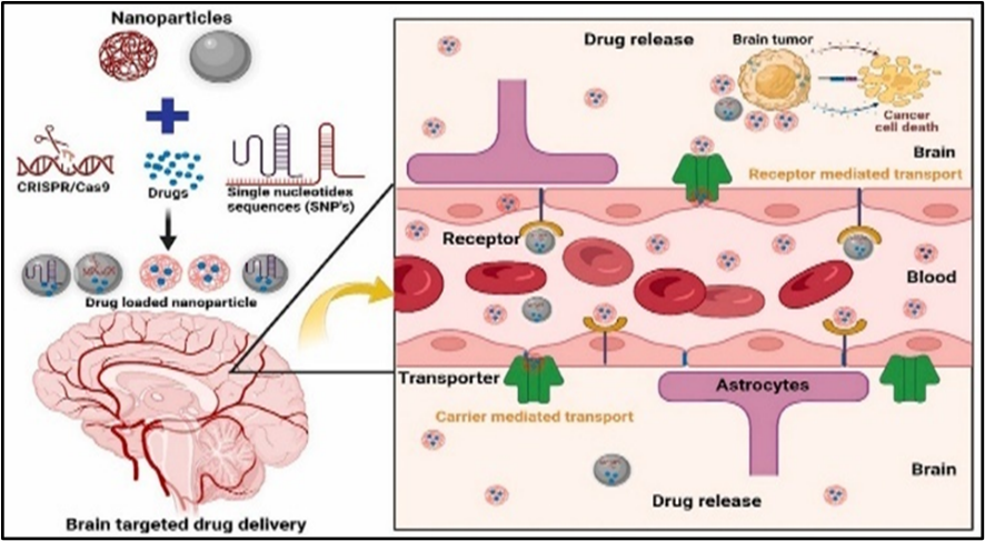 Nanoparticles are colloidal areas with size ranging from 10 to 1000 nm. They belong into two different groups: nanocarriers and nanodrugs. Accoutrements created by dissolving or dispersing specifics with colourful nanoparticles which can be categorised as either nanospheres or Nano capsules are appertained to as nanocarriers. The accoutrements used to make nanoparticles can be separated into two orders lipid accoutrements and polymers. The former is known as PNP and comprises polymeric micelles, polymer Nano capsules, and polymer nanospheres. The ultimate contains NLCs and nanoliposomes and is appertained to as a lipid nanoparticle. [1] The treatment of neurological conditions, including Alzheimer's complaint, Parkinson's complaint, brain tumours, and stroke, could be significantly impacted by nanotechnology. multitudinous exploration on neurodegeneration have demonstrated the effectiveness of using nanomaterials to treat problems of the central nervous system. Consequently, the targeted administration of chemotherapeutics made possible by nanocarriers has effectively braked the progression of nasty brain tumours. Because it increases the overall effect of the medicine and emphasises the significance of nano- rectifiers, the most effective use of nanomaterials is in the treatment of central nervous system conditions. The thing of this work was to examine the data regarding the use of nanotechnology in creating medicine delivery systems that can access the blood- brain hedge (BBB) and deliver remedial medicines to the central nervous system (CNS). [2]