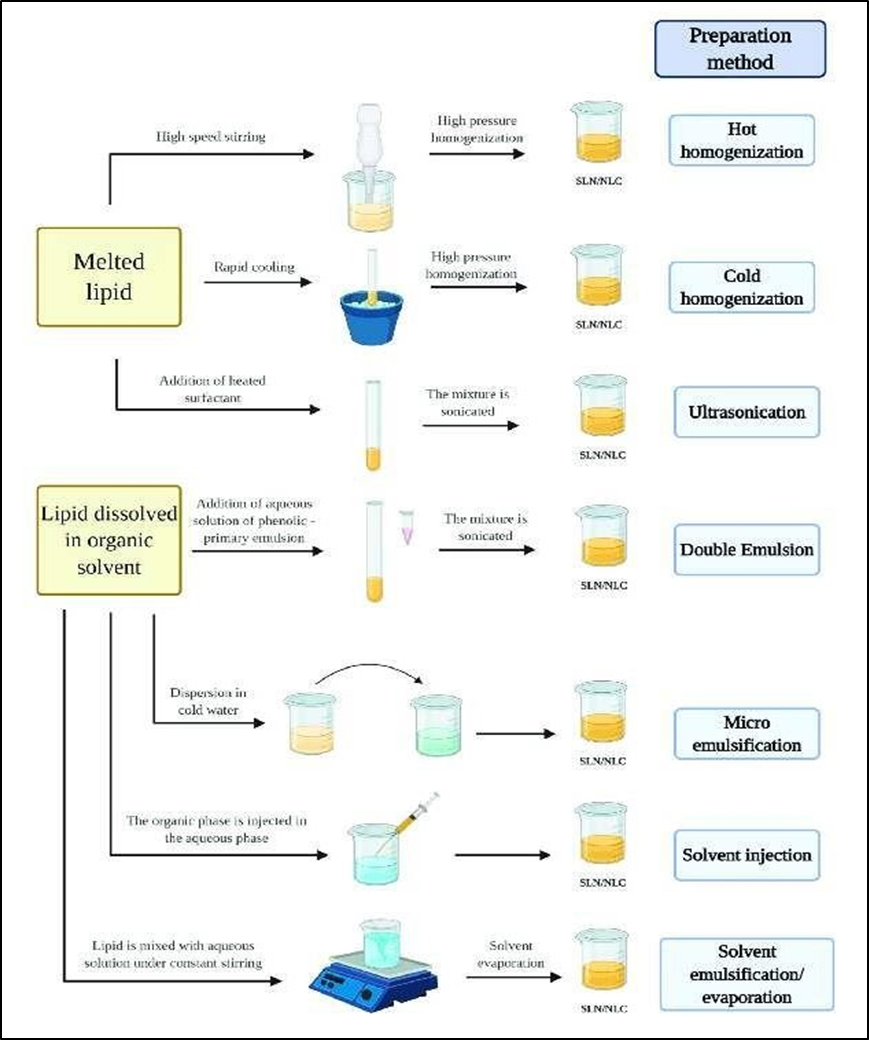 NLCs are prepared of solid lipid, liquid lipid, emulsifier, and solvent using several methods as outlined in Figure 5.