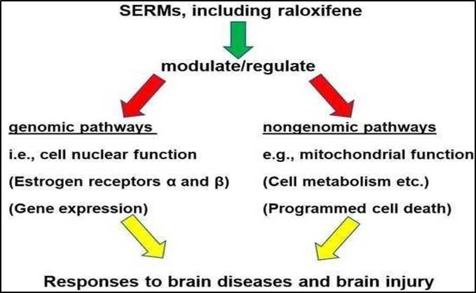 R-HCl, a benzothiophene, modulates estrogen. The investigated chemical has estrogen-agonistic effects on bone and lipid metabolism and estrogen antagonistic effects in uterine and breast tissues. R-HCl's strong affinity for estrogen receptors and gene expression regulation aid its biological effects. Binding affects oestrogencontrolled gene expression in diverse tissues. Estradiol can enter target cells' nuclei and bind to dormant estrogen receptors (ER). alpha (ERα) and beta (ERβ) are oestrogen receptor isoforms. The former activates, while the latter inhibits. Estradiol alters the proteins' structure, creating an E2-ER spatial arrangement. This facilitates dimerization and translocation. Figure 4 shows the occurrence. The entity has interacted with the ERE. A set of genes produces proteins with estrogenic effects on breast and uterine tissues. These genes need the estrogen response element (ERE) to work. [16]