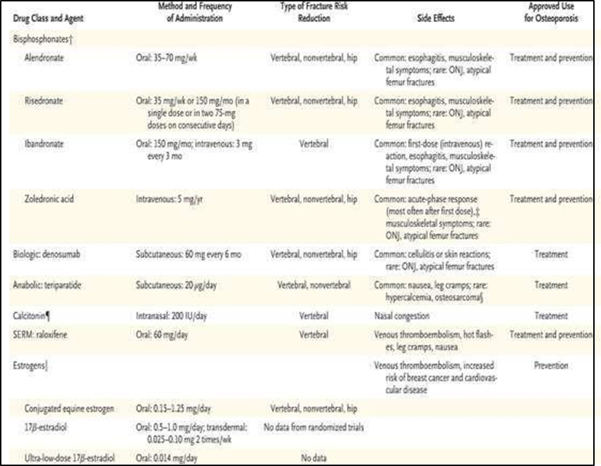 Oestrogen replacement therapy (ERT) is usually the first treatment for osteoporosis in postmenopausal women since a shortage of oestrogen is thought to cause bone loss. The ERT has a lot of complications, such as endometrial cancer, breast cancer which are the main side effects along with them the patient can experience other complications like hypertension, thromboembolic disease, etc. [9] R- HCl did not cause breast or vaginal bleeding. R- HCl also reduced breast cancer risk. The 3-year treatment reduced breast cancer risk by 76%. However, R-HCl treatment increased hot flushes and venous thromboembolism in women. [10] Androgen therapy is more effective at treating osteoporosis than oestrogen monotherapy. In moderate to severe acne, clinical hirsutism, androgenic alopecia, pregnancy, breastfeeding, and probable androgen-dependent neoplasia, testosterone therapy is not indicated. Bisphosphonates may cause jaw osteonecrosis and unusual subtrochanteric femoral fractures.[11] Calcitonin is only used to treat acute pain after a recent osteoporotic fracture. Calitonin does not work for persistent pain lasting more than three months. This drug can cause nausea, vomiting, flushing, allergic reactions, hypocalcemia, nasal symptoms, calcitonin antibodies, and prostate cancer.