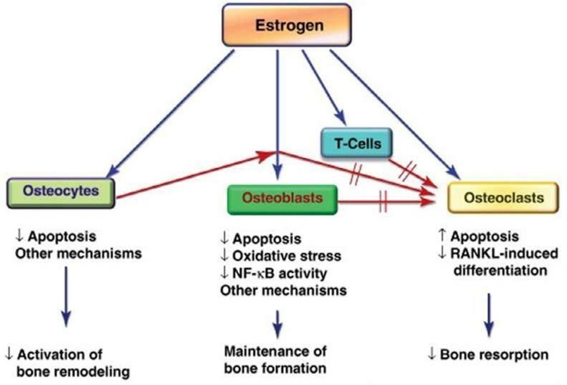 Figure 2: The estrogen regulation of bone turnover via effects on osteocytes, osteoblasts, osteoclasts, and T-cells