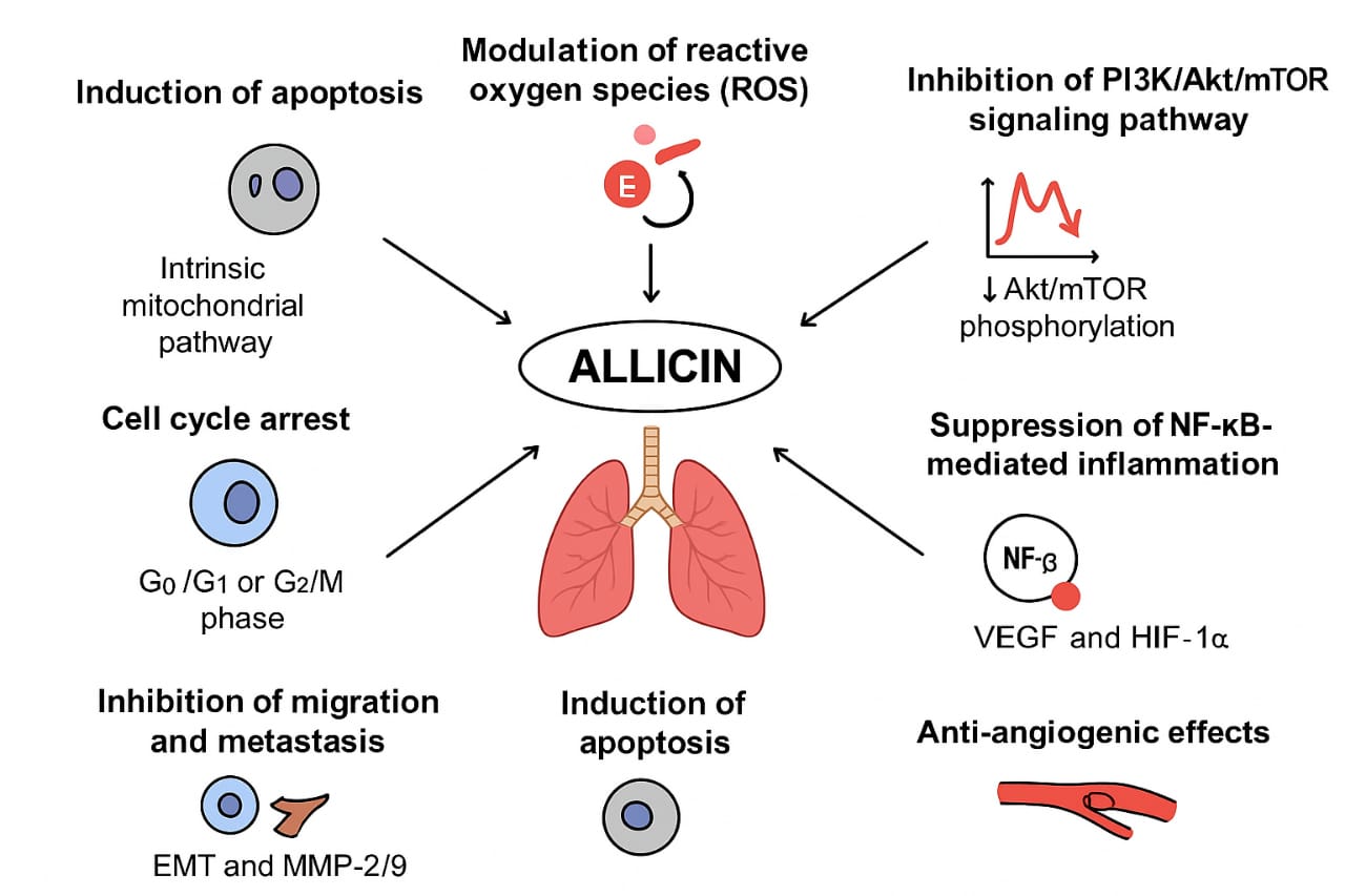 Mechanism of action: Allicin also promotes the generation of reactive oxygen species (ROS) within tumor cells. Elevated ROS levels cause oxidative stress, damaging cellular macromolecules such as DNA, proteins, and lipids. Cancer cells, which already maintain a higher basal oxidative state, are particularly susceptible to reactive oxygen species mediated cytotoxicity, making allicin selectively toxic to malignant cells while sparing normal cells. Another important anticancer mechanism of allicin involves cell cycle arrest. Allicin modulates the expression of key regulatory proteins, including cyclins and cyclin-dependent kinases (CDKs), leading to arrest at the G0/G1 or G2/M phase of the cell cycle. This inhibition prevents uncontrolled proliferation and limits tumor growth. Furthermore, allicin suppresses pro-survival and inflammatory signaling pathways, such as NF-κB, PI3K/Akt, and MAPK pathways, which are commonly overactivated in cancer. Inhibition of these pathways reduces cancer cell survival, angiogenesis, invasion, and metastasis. Allicin has also been shown to downregulate anti-apoptotic proteins (Bcl-2) while upregulating pro-apoptotic proteins (Bax), further shifting the balance toward cell death. In addition, allicin exhibits anti-metastatic and anti-angiogenic effects by inhibiting matrix metalloproteinases (MMPs) and reducing vascular endothelial growth factor (VEGF) expression. These actions limit tumor invasion and new blood vessel formation, thereby restricting tumor progression. Overall, the multitargeted nature of allicin combining apoptosis induction, oxidative stress generation, cell cycle inhibition, and suppression of oncogenic signaling pathways highlights its potential as a promising natural anticancer agent for both chemoprevention and adjunct cancer therapy [6,7,8].