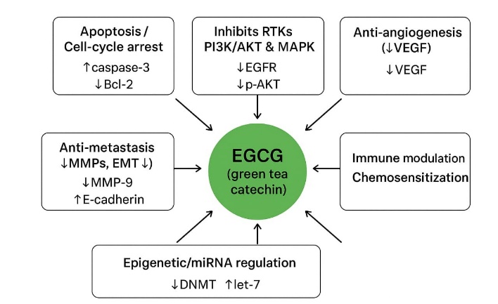 Mechanism of action: Induction of apoptosis and cell-cycle arrest EGCG activates intrinsic (mitochondrial) apoptotic pathways: ↑Bax, ↓Bcl-2/Bcl-XL, mitochondrial membrane depolarization, cytochrome-c release and caspase-3/9 activation. It also modulates extrinsic apoptosis (death receptors) in some models and induces G0/G1 or G2/M cell-cycle arrest via upregulation of p21/p27 and downregulation of cyclins/CDKs. Inhibition of pro-survival signaling pathways (proliferation) EGCG inhibits receptor tyrosine kinase pathways important in lung cancer (EGFR, IGF-1R) and downstream cascades: PI3K/AKT/mTOR, RAS/RAF/MEK/ERK (MAPK), JAK/STAT3. Inhibition of these nodes reduces proliferation and promotes apoptosis. Anti-angiogenic effects EGCG reduces VEGF expression and VEGFR signaling and suppresses angiogenesis in tumor models (reduced micro vessel density and VEGF transcription via STAT3/NF-κB suppression). This limits tumor nutrient supply and metastasis potential. Anti-metastatic and anti-invasive actions EGCG downregulates matrix metalloproteinases (MMP-2, MMP-9), inhibits epithelial-to-mesenchymal transition (EMT) markers (↓vimentin, ↑E-cadherin), and reduces migration/invasion in NSCLC cell lines and animal models. Oxidative stress modulation: antioxidant and context-dependent pro-oxidant EGCG is a strong radical scavenger (antioxidant), lowering oxidative DNA damage and mutation risk. Paradoxically, at higher doses in cancer cells EGCG can act pro-oxidant (↑ROS) and produce oxidative stress that triggers apoptosis this duality is dose- and context-dependent. Epigenetic regulation & miRNA modulation EGCG alters DNA methylation (inhibits DNMTs), histone acetylation, and modulates tumor-suppressor/oncogenic miRNAs (e.g., upregulates let-7, miR-16; downregulates some oncogenic miRNAs), thereby reprogramming gene expression toward growth suppression [1,5,26].