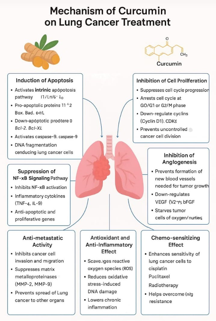 Mechanism of action: It induces apoptosis predominantly via the intrinsic mitochondrial pathway by up-regulating pro-apoptotic proteins such as Bax, Bad, and Bid, while down-regulating anti-apoptotic proteins including Bcl-2 and Bcl-xL, leading to activation of caspase-9 and subsequent DNA fragmentation. Curcumin also inhibits lung cancer cell proliferation by suppressing cell cycle progression and inducing arrest at the G0/G1 or G2/M phases through down-regulation of cyclins (such as cyclin D1) and cyclin-dependent kinases (CDKs). Furthermore, it suppresses the NF-κB signaling pathway, resulting in reduced expression of inflammatory cytokines like TNF-α and IL-6, as well as inhibition of genes involved in cell survival and proliferation. Curcumin exhibits potent anti-angiogenic effects by downwards vascular endothelial growth factor (VEGF) and basic fibroblast growth factor (bFGF), thereby inhibiting tumor-associated neovascularization and limiting nutrient and oxygen supply to tumor cells. Its anti-metastatic activity is mediated through inhibition of cancer cell invasion and migration by suppressing matrix metalloproteinases such as MMP-2 and MMP-9. Additionally, curcumin acts as a strong antioxidant and anti-inflammatory agent by scavenging reactive oxygen species (ROS), reducing oxidative stress-induced DNA damage, and lowering chronic inflammation. Importantly, curcumin enhances chemosensitivity of lung cancer cells to conventional therapies including cisplatin, paclitaxel, and radiotherapy, thereby helping to overcome drug resistance and improve therapeutic efficacy [19,25].