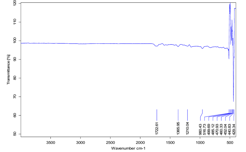 IR spectroscopy was used to characterize the molecular structure of bixin using a Bruker OPUS system. Dry extract powder was and the IR spectrum displaying key vibrations was obtained (figure 7). The FT-IR spectrum of the extracted bixin showed the following absorption bands.
