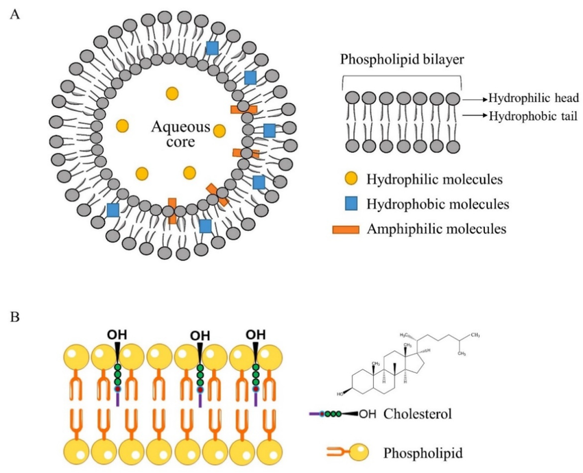 Liposomal membranes are very similar to cellular membranes and mainly consist of phospholipid bilayers. Phospholipids are amphiphilic molecules with hydrophilic phosphatidyl head groups and hydrophobic fatty acid tails. Their molecular structure enables them to self-assemble into vesicular structures when they are hydrated in aqueous conditions. Similar to its presence in the plasma membrane, where it aids in membrane stability and regulates drug release, cholesterol (CH) may be easily absorbed into the liposomal bilayer.[5]