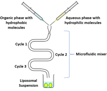 In a round-bottom flask, lipids and hydrophobic medications are first dissolved in an appropriate organic solvent. After that, a thin lipid coating is formed on the flask's inner wall by carefully evaporating the organic solvent under low pressure. The thin film is then hydrated with an aqueous buffer solution at a temperature greater than the phase transition temperature (Tm) of the lipids. The hydration medium may contain hydrophilic medications intended to be contained in the watery core of the liposomes.