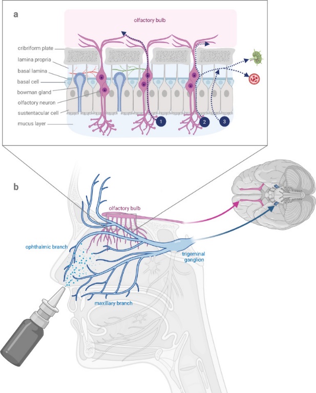 Compared with the olfactory pathway, the trigeminal route connects to different CNS regions, including brainstem nuclei and spinal cord, and may contribute to broader brain distribution [1,12].