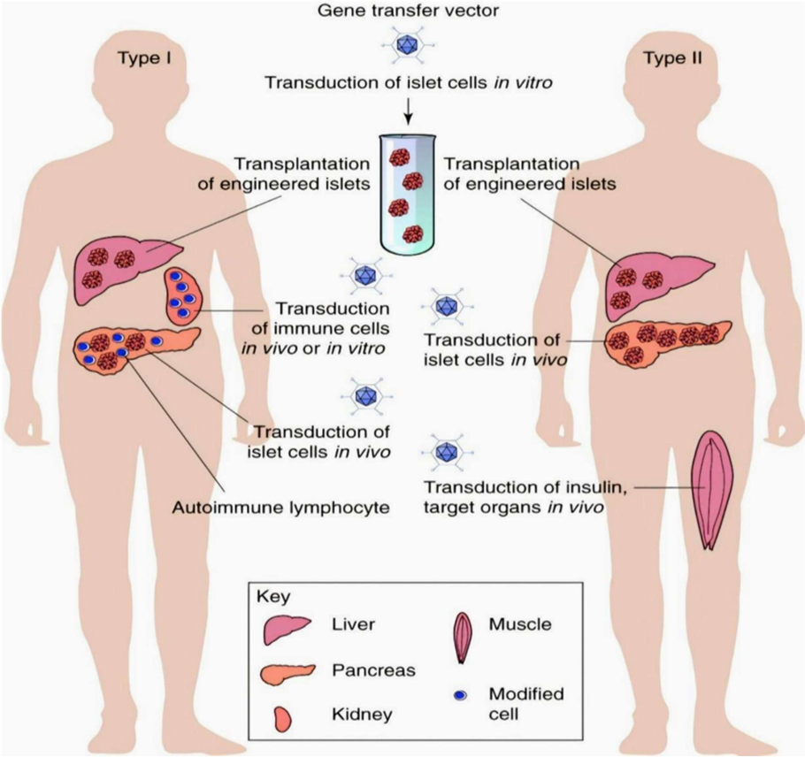 Cell and gene therapy approaches are highly promising for diabetes treatment, applying regenerative and molecular techniques to restore insulin production and improve metabolic control. These therapies primarily target Type 1 diabetes mellitus, but innovations are expanding their scope to Type 2 diabetes as well.[14]