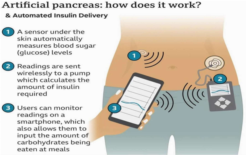 ? MONITORING: A continuous glucose monitor (CGM) inserted under the skin measures glucose level in the intestinal fluid in real-time and sends this data wirelessly to a control algorithm device.