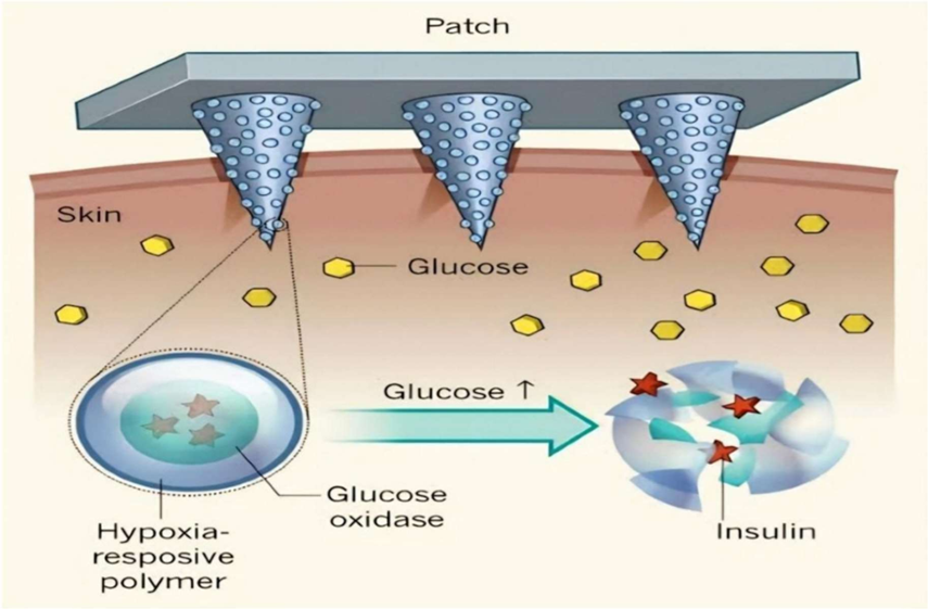 Smart insulin patches use micro needles coated with glucose-sensing polymers; these needles painlessly penetrate the skin and release insulin in response to increased glucose detected in the interstitial fluid.[12]
