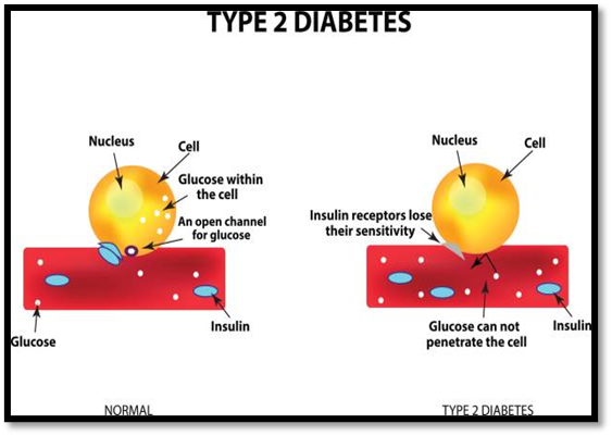 Figure no. 3: Illustration depicting insulin resistance in Type 2 diabetes, where reduced insulin receptor sensitivity prevents glucose uptake into cells despite the presence of insulin.