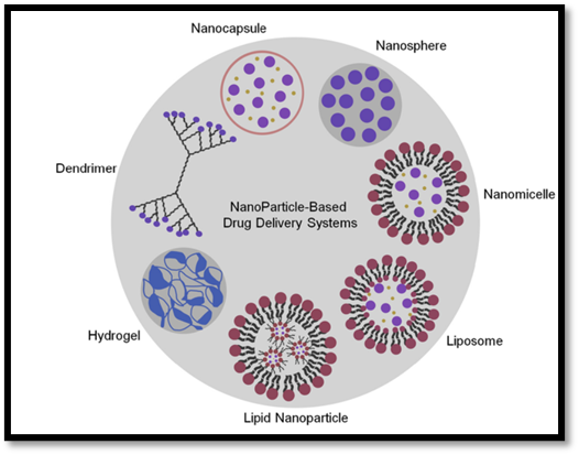 Figure no 7: Schematic representation of various nanoparticle-based drug delivery systems, including nanocapsules, nanospheres, dendrimers, nanomicelles, liposomes, hydrogels, and lipid nanoparticles