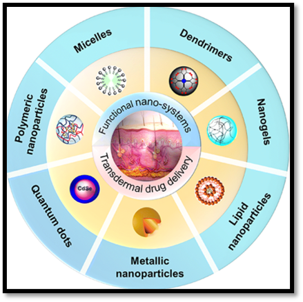 Figure no.6: Classification of functional nanosystems—such as micelles, dendrimers, nanogels, lipid, polymeric, metallic nanoparticles, and quantum dots—used in transdermal drug delivery applications.