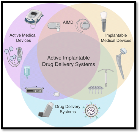 Figure no. 8: Conceptual overlap of active medical devices, implantable medical devices, and drug delivery systems illustrating the integrated framework of active implantable drug delivery systems (AIMDs).