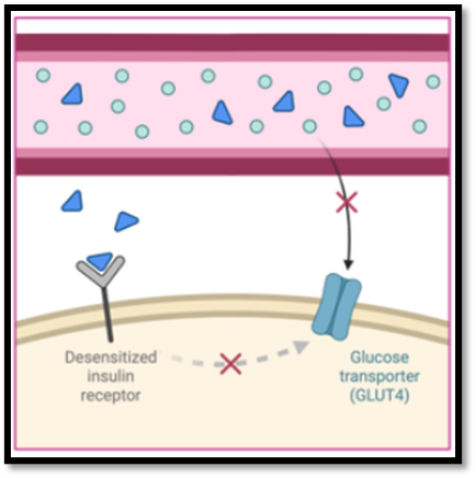 Figure no 4: Schematic representation of insulin resistance showing desensitized insulin receptors and impaired GLUT4 translocation, resulting in reduced cellular glucose uptake.