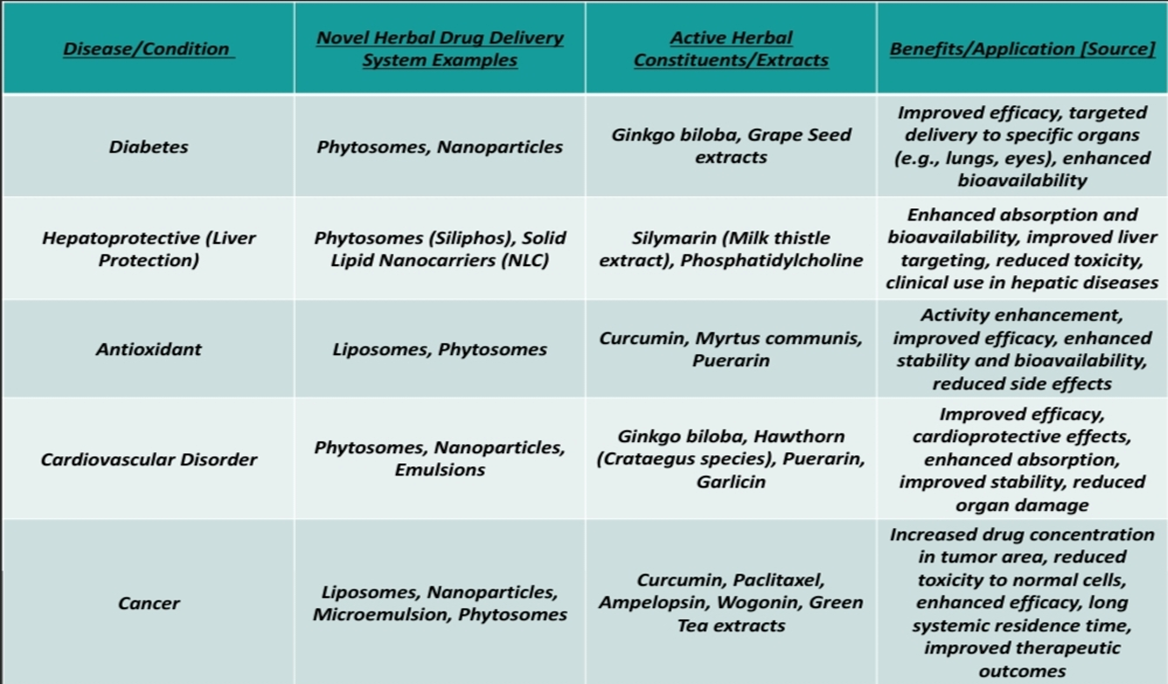 Improved stability and absorption of herbal actives, reduced toxicity, enhanced therapeutic efficacy, and controlled release.