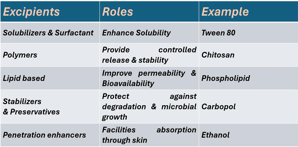 Excipients play a vital role in improving stability, solubility, bioavailability, and targeted delivery of herbal drugs. Commonly used excipients include:
