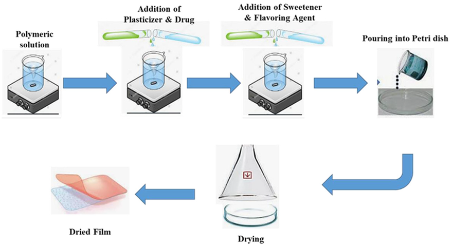 The most widely used method. Steps include polymer dispersion, drug dissolution, mixing, deaeration, casting, drying, and cutting.