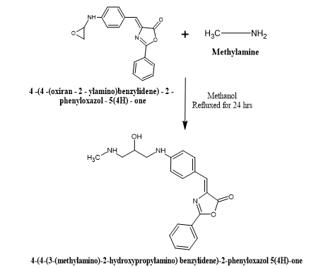 A mixture of the compound 4-[4-(oxiran-2-yl methylamino) benzylidene]-2-phenyloxazol-5-(4H)-one (V) (0.013 mol) and methylamine (VIII) (0.013 mol) in 40 mL of methanol was heated and refluxed for 24 hours. After completion of the reaction, the product was filtered, vacuum dried, and recrystallized using methanol. Yellow crystals of the final product were obtained57.