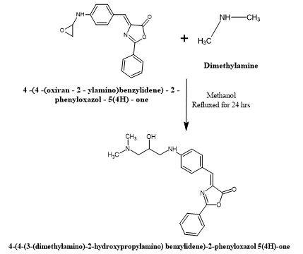 A solution containing the compound 4-[4-(oxiran-2-yl methylamino) benzylidene]-2-phenyloxazol-5-(4H)-one (V) (0.013 mol) and dimethylamine (X) (0.013 mol) in 40 mL of methanol was refluxed for 24 hours. The product was then filtered, vacuum-dried, and recrystallized with methanol. A reddish-brown product was obtained57.
