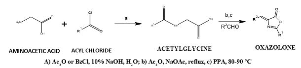 Oxazolone is a derivative of the oxazole nucleus. Erlenmeyer azlactone synthesis is the general method of synthesis of oxazolone (Other methods such as The Bergmann synthesis, DCC Method (Di cyclo hexyl carbodiimide, Miscellaneous methods, etc.). The functional groups substituted at the 4 and 2 positions play a key role in the activity of oxazolone. Research indicates that a total of seventeen azlactones or oxazolones were primarily synthesized using commercially available glycine with benzoyl chloride or acetic anhydride, in the presence of anhydrous sodium acetate, under Erlenmeyer conditions along with the required aldehyde, yielding very high product amounts.