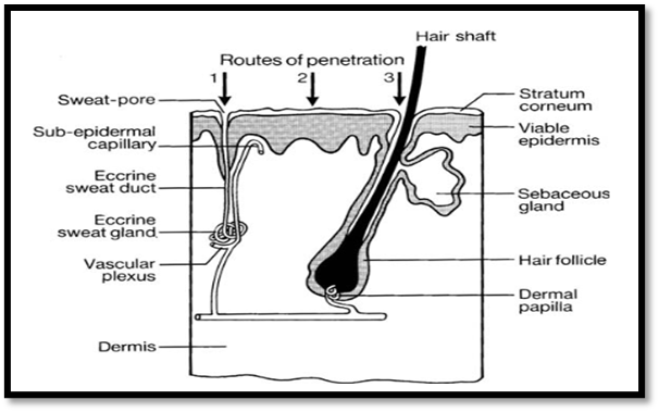 Fig 2: Simplified diagram of skin structure and macroroutes of drug penetration: (1) via the sweat ducts, (2) across the continuous stratum corneum, or (3) through the hair follicles with their associated sebaceous glands.