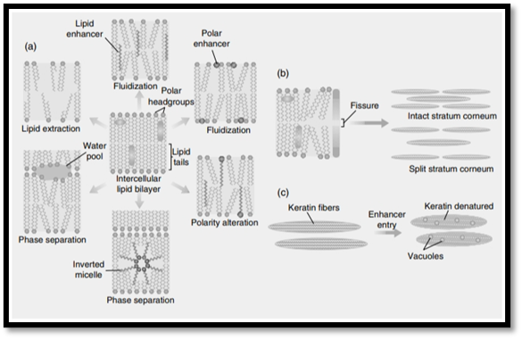 Mechanism Of Action of Penetration Enhancers: The miscibility and solution enhancers can be responsible for improved transdermal distribution of water soluble drugs. Mechanism to promote penetration of oil soluble medicines are caused by partial leaching of epidermal lipids by improving drug permeability through the skin. To improve penetration of lipophilic compounds there required to change partitioning features at the stratum corneum live tissue interface. This could be achieved by combining a penetration enhancer including a co-solvent. Some enhancers make keratin swell and leach out necessary structural material from the stratum corneum, which reduces diffusional resistance and increasing the permeability. [13,14]