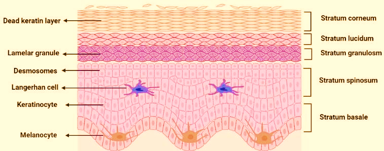 Layers of the epidermis include the outermost stratum corneum, the middle stratum germinativum, the outer stratum spinosum, and the innermost stratum granulosum. An inter-cellular lipid region separates the layers of keratinized corneocytes that make up SC, which is around 15 µm thick [4]. See Figure 2 for a simplified depiction of the skin. Ceramides, free fatty acids, neutral lipids, and triglycerides make up the inter-cellular lipid domain. Essential for desquamation include the remainder of the elements, which include phospholipids, glycosphingolipids, as well cholesterol. The arrangement of the corneocytes in the lipid-protein matrix resembles a brick wall. The lipid-protein matrix is like mortar while the corneocytes are like bricks. Corneo-desmosomes attach the thickly overlapping corneocytes to one another, and an intricate intercellular lipid matrix holds them all in place. An important permeability barrier for hydrophilic molecules with molecular masses larger than 200-350 Da, they're essential in maintaining the firmness along with impermeability of undamaged skin [5].