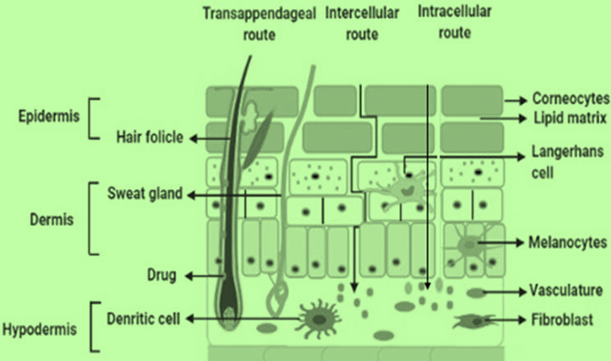 Various drug compounds have the ability to pass the epidermal barrier and reach the bloodstream via various pathways. According to Figure 3, these pathways may go intracellularly, intercellularly, or transfollicularly. Diffusion may take place via the intracellular pathway. Nonetheless, the intercellular gaps were the primary pathways for diffusion in the experimental research. This is because this route contains moistened keratin, a protein cell membrane, an interconnected covalent lipid a single-layer, and free lipids between cells. The several partitioning-diffusion steps across the hydrophilic as well lipophilic domains of this route prevent the majority of medicines from passing through the SC. As an example, when medications follow the intracellular route, those with a high lipophilicity will not be able to cross the hydrophilic domains.