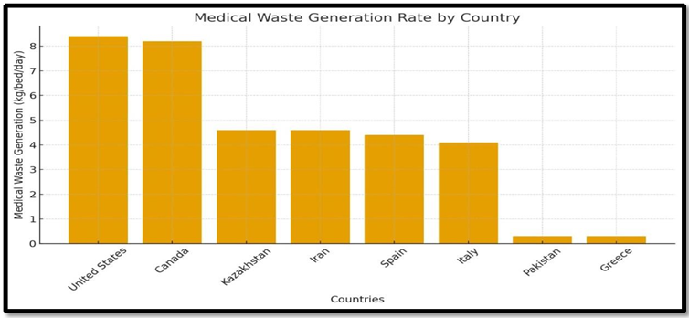 Each nation's average rate of medical waste creation is shown with the environmental performance index of that nation's managed solid waste management. According to the findings, industrialized and high-income countries generate medical waste at a far higher rate than do low- and middle-income countries. The average waste generation rate per day is between 0.3 and 8.4 kg/bed. The largest amounts of medical waste are produced in the US and Canada (8.4 and 8.2 kg/bed/day, respectively). In Asia, Kazakhstan and Iran produce the most medical waste (4.6 kg/bed/day), whereas Spain and Italy produce the most in Europe (4.4 and 4.1 kg/bed/day, respectively). The lowest amounts of medical waste are produced in Greece and Pakistan (about 0.3 kilogram per bed per day, respectively).