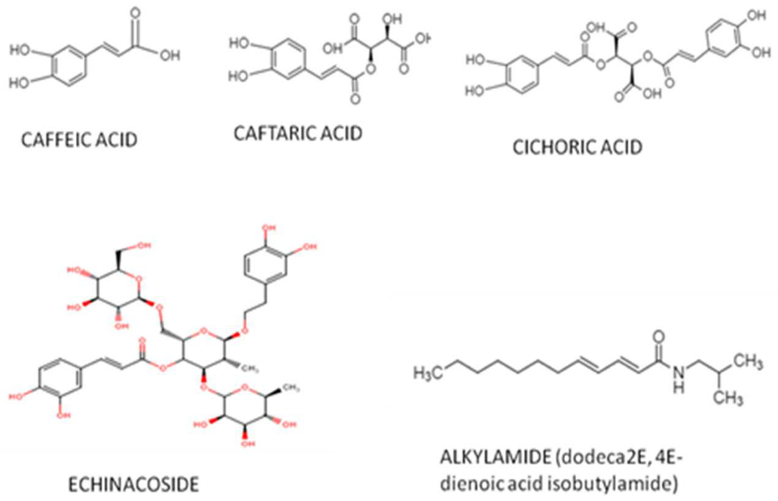 Various compounds belonging to different classes of secondary metabolites have been isolated and identified in E. purpurea extract. Alkamides, caffeic acid derivatives, and polysaccharides are the three major groups of secondary metabolites in the plant, which have been considered mostly in manuscripts. In one study, 10 alkamides, mostly with isobutylamide and 2-methylbutylamide moieties, have been successfully purified from the n-hexane extract of the plant root.[38] Purification of the chloroform extract of the plant root also has resulted in the purification of some alkamides with isobutylamide and 2-methylbutylamide moieties and nitidanin-diisovalerianate as well as a sequesterpene, 1β-hydroxy-4 (15),5E,10 (14)-germacratriene, using chromatographic methods.[39] Isolated alkamides (with isobutylamides) mostly contained 2,4-dienoic units in their structures.[40] The results of a high-performance liquid chromatography-diode array detector-mass spectrometry (HPLC-DAD-MS) analysis of the roots and aerial parts of the plant showed that the storage conditions and methods of the extraction can significantly influence the contents of cichoric acid and alkamide derivatives.[41] Contents of alkamides and cichoric acid in E. purpurea (root and aerial parts) have been analyzed in different samples, and the results showed that high-quality root contains more than 6 mg/g alkamides, while cichoric acid content for root and aerial parts was evaluated as more than 15 mg/g. The aerial parts of the plant usually cannot be considered as a source of alkamides. For marketing, a minimum standard level could be assumed as > 3 mg/g for alkamides and > 5 mg/g for cichoric acid.[42] Polysaccharides and polyacetylenes along with glycoproteins were also purified from the aerial parts of the plant as well.[40] The juice of the plant contains heterogeneous polysaccharides (MW < 10 kDa), inulin-type fractions (MW = 6 kDa) and acidic highly branched arabinogalactan polysaccharide (MW = 70 kDa). Arabinogalactan-protein isolated from the aerial parts of the plant is composed of 83% polysaccharide (galactose/arabinose), 4-5% uronic acids, and 7% protein, with high concentrations of serine and hydroxyproline. [40,81] Other compounds including alkaloids, amides, and flavonoids (quercetin, kaempferol, isorhamnetin and their free phenolic acids including p-coumaric, p-hydroxybenzoic, and protocatechuic acids) have also been isolated and identified from the plant.