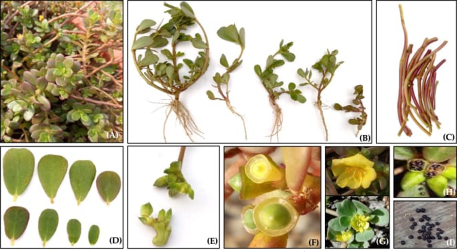 A common medicinal plant, purslane (Portulaca oleracea L.) is used as a traditional remedy for a variety of illnesses in addition to being utilised as an eating plant. In different places, it is referred to by several synonyms, including Purslane (USA and Australia), Andulam (Malaysia), Pourpier (France), and Pigweed (England) [1]. Given that the plant has a milky liquid, the name Portulaca is believed to be a combination of the Latin words "porto," which means "to carry," and "lac," which means "milk." Numerous phytochemicals, including fatty acids, terpenoids, polysaccharides, anthraquinone glycoside, cardiac glycoside, flavonoids, alkaloids, coumarins, and minerals, proteins, sterols, and vitamins. Antibacterial, antiulcerogenic, anti-inflammatory, antioxidant, wound-healing qualities, purgative, cardiac tonic, emollient, muscle relaxant, diuretic therapy, and osteoporosis and psoriasis are just a few of its numerous pharmacological effects [2]. The need for food will rise as a result of this demographic expansion. But unsustainable farming Conventional agricultural methods and practices will not be able to handle these issues. The issue is made worse by abiotic variables such temperature changes, precipitation, CO2 levels, and growing fertiliser prices, which result in decreased soil fertility and elevated salinity [3]. It is an annual herbaceous succulent plant that thrives in warm climates. In many Mediterranean and tropical Asian nations, it is widely consumed as herb and added to soups and salads. It has also been utilised as a traditional medicine in numerous nations [4]. The annual succulent Portulaca oleracea, which belongs to the Portulacaceae family, can grow up to 40 cm in height. There are currently about forty kinds grown. There is uncertainty over the species' status in the New World: Although it is often regarded as an alien weed, there is proof that the species was found in the sediments of Crawford Lake (Ontario) between 1430 and 89 AD, indicating that it arrived in North America during the pre-Columbian period2. In certain places and elsewhere, it has become naturalised. It's regarded as an invasive plant. It features primarily prostrate, smooth, reddish stems with alternate leaves grouped at the ends and joints of the stems. The golden flowers are up to 6 mm diameter and consist of five regular sections. The flowers can appear at any time of year, depending on the amount of rainfall [5].