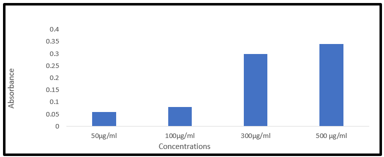 Hydroalcoholic extract of plant in different concentration ranging from 100 to 500 µg/ml were added to each test tube individually containing 3ml of distilled water and 1ml of molybdenum reagent. These test tubes were kept in incubator at 95°c for 90 minutes After incubation these test tubes were normalised to room temperature for 20-30 minutes and absorbance of reaction mixture was measured at 695nm. Mean value from three independent sample were calculated for each extract. Ascorbic acid was used as reference standard.