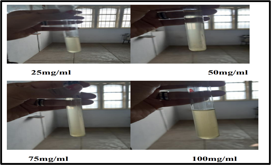 25mg/ml 50mg/ml 75mg/ml 100mg/ml from the above observation it shows that as the concentration increases, the antimicrobial activity of Tectona grandis leaf extract increases.