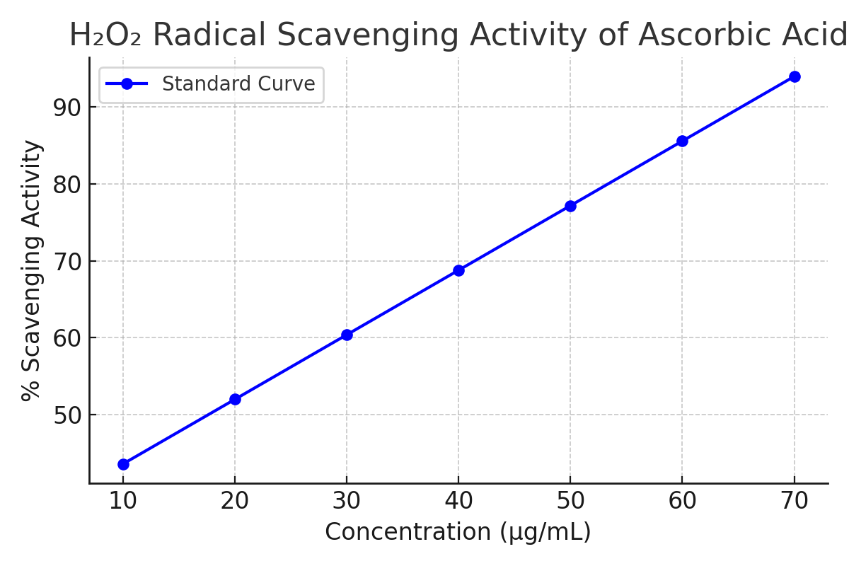 A 40 mM hydrogen peroxide (H?O?) solution was prepared using phosphate buffer at pH 7.4. To this, 2 ml of the plant extract (ranging from 20 to 100 µg/ml) dissolved in phosphate buffer was added to 1 ml of the H?O? solution. After a reaction time of 10 minutes, the absorbance was measured at 245 nm using a blank containing only phosphate buffer without hydrogen peroxide. The hydrogen peroxide scavenging activity of the extract and the reference compound, ascorbic acid, was evaluated using the following formula:?