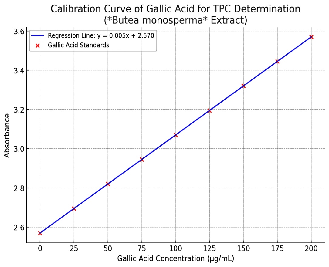The total phenolic content of the extracts was assessed using the Folin–Ciocalteu method. Gallic acid served as the standard, and results were expressed in terms of milligrams of gallic acid equivalent (GAE) per gram of extract. Standard solutions of gallic acid were prepared in ethanol at concentrations of 0.01, 0.02, 0.03, 0.04, and 0.05 mg/ml. Plant extract solutions were also prepared in ethanol at concentrations of 0.1 mg/ml and 1 mg/ml.? A volume of 0.5 ml from each sample was added to test tubes, followed by 2.5 ml of 10-fold diluted Folin–Ciocalteu reagent. After that, 2 ml of 7.5% sodium carbonate solution was added. The test tubes were sealed with parafilm and left to react at room temperature for 1 hour. The absorbance of the resulting blue-colored solution was measured at 765 nm using a spectrophotometer. ?Each sample analysis was carried out in triplicate. The Folin–Ciocalteu reagent reacts with reducing agents, such as polyphenols, leading to the formation of a blue complex which can be quantified spectrophotometrically.? A standard calibration curve was constructed using the gallic acid standards, and the regression equation obtained was: y = 0.005x + 2.570 with a correlation coefficient R² = 0.992, indicating a strong linear relationship. The concentration of phenolics in the plant samples was calculated by substituting the sample absorbance (y) into the regression equation [13].
